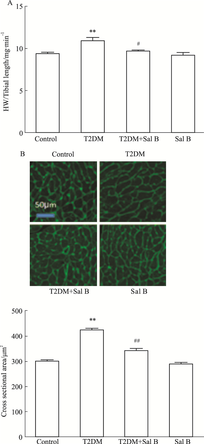 | Fig 1 Effect of Sal B on heart weight/tibial length(A) and myocardial cross-sectional area(B) in mice with type 2 diabetes melitus **P < 0.01 vs control group; #P < 0.05, ##P < 0.01 vs T2DM group |