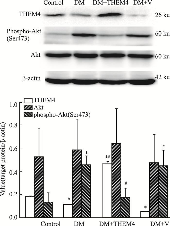 | Fig 2 THEM4, phospho-Akt (Ser 473) and Akt protein expressions in renal cortex examined by Western blot *P < 0.05 vs control group; #P < 0.05 vs DM+V group |