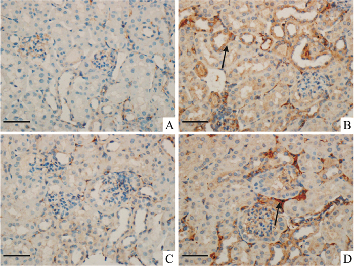 | Fig 3 Immunohistochemical staining for THEM4 in kidneys of mice of four groups (Scale bar: 50 μm) A: Control group; B: DM group; C: DM+ THEM4 group; D: DM+V group. Black arrows show positive signal. |