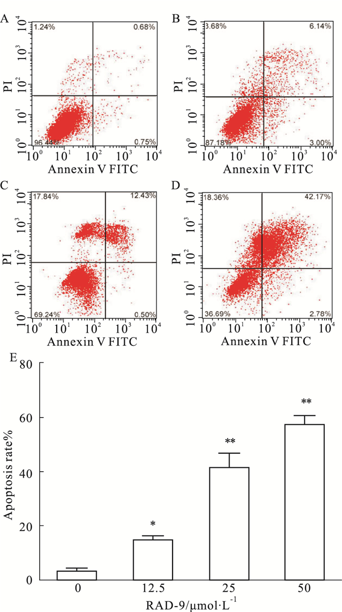 | Fig 1 Effect of different concentrations of RAD-9 on apoptosis of MGC-803 cells(x±s, n=3) A:Control group; B:12.5 μmol·L-1 RAD-9;C:25 μmol·L-1 RAD-9;D:50 μmol·L-1 RAD-9;E:Bar graph of apoptosis rate.*P<0.05, **P<0.01 vs control(0 μmol·L-1) |