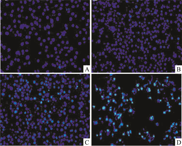 2.4 Hoechst 33258染色法观察细胞核的凋亡形态将对数期的MGC-803细胞接种到内嵌有经过无菌处理的盖玻片的6孔板中, 待细胞长至80%汇合时, 吸出孔内培养基, 加入用培养基配好的含有不同浓度RAD-9(0、12.5、25、50 μmol·L-1)的药液, 置于37℃、5% CO2培养箱中培养36 h, 吸出孔内液体, 用PBS轻轻漂洗3遍, 加入4%多聚甲醛固定20 min, 吸出4%多聚甲醛后, 用PBS轻轻漂洗3遍, 再用Hoechst 33258工作液室温避光染色20 min, 吸出工作液, 用PBS轻轻漂洗3遍, 再用抗荧光淬灭封片液(甘油:PBS=1 :9)封片, 于荧光显微镜下观察拍照。