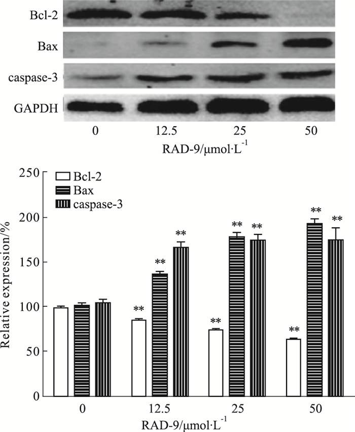 2.5 Western blot检测相关蛋白表达将对数期的MGC-803细胞接种于25 cm2的培养瓶中, 待细胞长至80%汇合时, 吸出培养基, 加入用培养基配好的含有不同浓度RAD-9(0、12.5、25、50 μmol·L-1)的药液, 置于37℃、5% CO2培养箱中培养36 h, 吸出并收集瓶内液体, 用PBS轻轻漂洗3遍, 再加入细胞裂解液冰上裂解30 min, 12 000 r·min-1离心30 min, 用BCA法检测蛋白浓度。加入适量上样蛋白缓存液, 于沸水浴中高温变性8 min, 取50 μg的蛋白, 经10% SDS-PAGE电泳分离后, 使蛋白转移至PVDF膜上, 用5% BSA室温封闭40 min, 再将PVDF膜置于配好的一抗中冰上孵育过夜, 二抗室温孵育60 min, 用TBST室温避光洗膜3遍, 最后利用双色红外荧光扫描成像系统扫膜并采集图像。每组实验重复3次。
