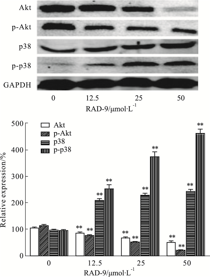| Fig 4 Effect of RAD-9 on expression of Akt, p-Akt, p38, p-p38 proteins in MGC-803 cells (x±s, n=3) **P < 0.01 vs control(0 μmol ·L-1) |