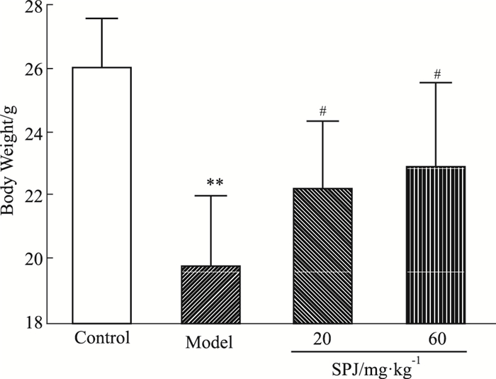 3 结果 3.1 小鼠一般情况及体质量变化荷瘤小鼠较正常组小鼠食欲明显下降,活动减少,皮毛颜色暗淡,精神萎靡。竹节参总皂苷干预后,低、高剂量组小鼠体质量与自发性活动均增加,且高剂量组变化更为明显。去瘤后体质量恶病质小鼠较正常组明显下降,且模型组下降最为明显(P<0.01),低、高剂量组小鼠体质量较模型组升高(P<0.05),见Fig 1。