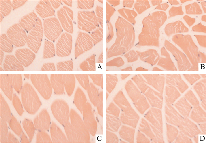 2.4.2 腓肠肌纤维横切面积的检测将经福尔马林溶液固定的腓肠肌组织采用常规方法包埋成石蜡块,4 μm厚度连续横切片,常规HE染色后,光镜观察,采集图片。