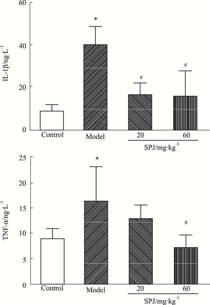 | Fig 3 Effects of SPJ on IL-1β and TNF-α levels in serum of cachexia mice(x±s, n=8) *P < 0.05 vs control; #P < 0.05 vs model |