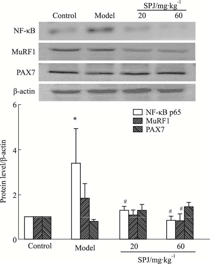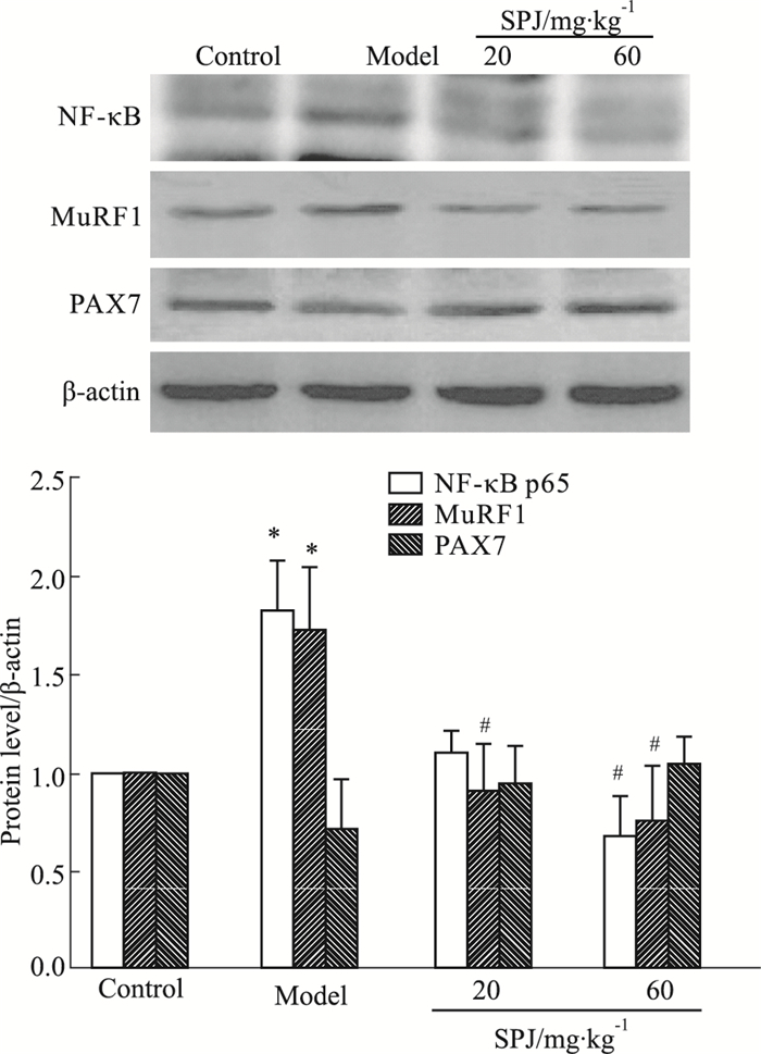 | Fig 4 Effects of SPJ on protein expression of NF-κB, PAX7 and MuRF1 in gastrocnemius muscle(x±s, n=4) *P < 0.05 vs control; #P < 0.05 vs model |