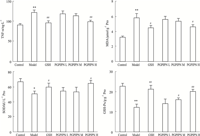 如Fig 1所示,与正常对照组相比,模型组小鼠肝组织TNF-α、MDA含量明显升高,GSH-Px和SOD活性明显降低,差异具有显著性(P < 0.01)。与模型组相比,PGPIPN高剂量组和GSH组能够明显降低小鼠肝组织内TNF-α、MDA含量,提高GSH-Px和SOD活性; PGPIPN中剂量组能明显增加GSH-Px活性(P < 0.05);而PGPIPN低剂量组对上述4个指标均无明显影响。
