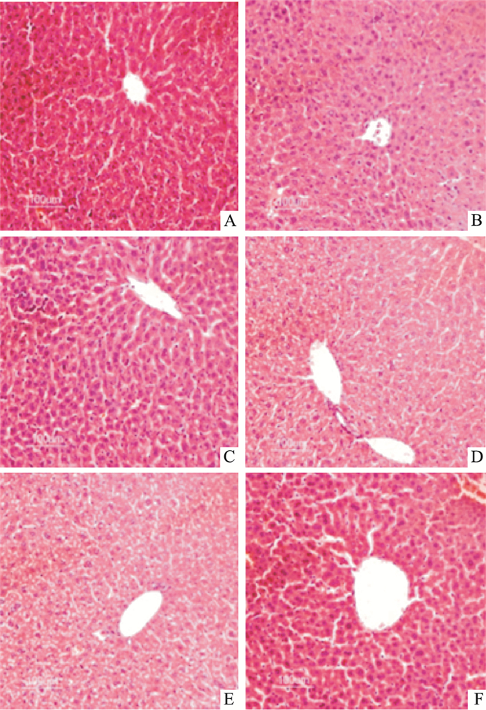 | Fig 2 Pathological observation of liver tissues in mice by HE staining (×200) A: Control; B: Model; C: GSH; D:PGPIPN 0.04 mg·kg-1; E:PGPIPN 0.4 mg·kg-1; F:PGPIPN 4 mg·kg-1 |