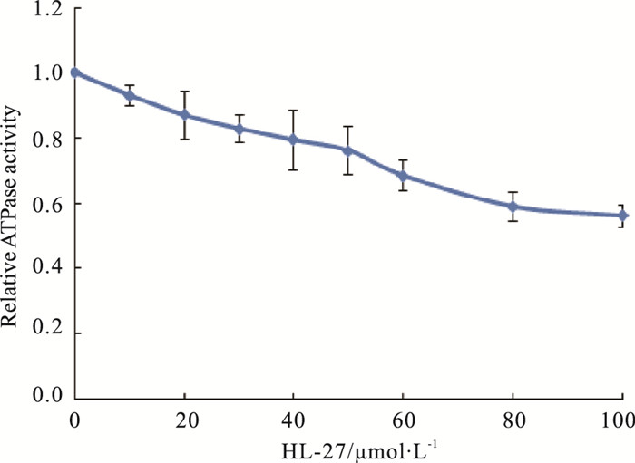 1.3.4 HL-27对BLM642-1290解旋酶ATPase活性影响的检测利用孔雀绿-磷钼酸铵比色法检测HL-27对BLM解旋酶ATPase活性的影响。取终浓度为125 nmol·L-1的BLM解旋酶、终浓度为100 nmol·L-1的ssDNA(45 nt)和不同终浓度(0~100 μmol·L-1)的HL-27于反应缓冲液(50 mmol·L-1三乙醇胺、50 mmol·L-1 KCl、20 mmol·L-1 MgCl2,pH 7.5)中作为反应底物,室温下孵育10 min;然后加入终浓度为2 mmol·L-1的ATP,室温下孵育20 min。实验中通过调节ddH2O的体积,保持反应体系总体积为75 μL。取出上一步反应混合液50 μL,迅速加入到850 μL染液中以终止ATP水解反应,1 min后,再加入100 μL 34%的柠檬酸溶液以终止显色反应。处理完毕后,各吸取100 μL转入96孔板,于660 nm波长处3次读值。实验数据都经过3次重复实验确定无误。采用国际单位定义表示酶量的多少,即每分钟催化1 μmol底物水解所需的酶量为1个国际单位(unit)。其酶活力Aactivity(kU·L-1)可由以下方程式计算得出: