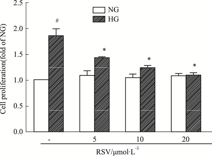 2 结果 2.1 白藜芦醇呈浓度依赖性地抑制GMC细胞增殖如Fig 1所示,与正常培养的GMC(含5.6 mmol·L-1 glucose, NG)相比,高糖培养24 h的GMC(含30 mmol·L-1 glucose, HG)可明显促进细胞的增殖(P < 0.05),这与既往文献报道的结果一致[12]。用不同浓度的白藜芦醇对未加高糖刺激的正常培养的GMC干预24 h后发现,其对正常培养的GMC无明显影响,说明本实验中选用的5、10、20 μmol·L-1浓度的白藜芦醇对GMC没有毒性。与高糖培养的GMC相比,不同浓度的白藜芦醇预处理2 h后,再与高糖同处理24 h,可浓度依赖性地抑制高糖诱导的GMC增殖(P < 0.05),其中20 μmol·L-1浓度抑制效应最佳。