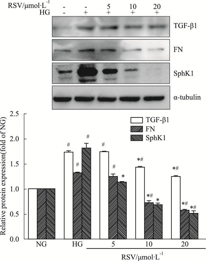 | Fig 2 Effects of resveratrol on FN, TGF-β1 and SphK1 protein expression in high glucose- induced mesangial cells(x±s, n=3) GMC was pretreated with different resveratrol for 2 h, and then stimulated by high glucose for further 24 h. #P < 0.05 vs NG; *P < 0.05 vs HG. |