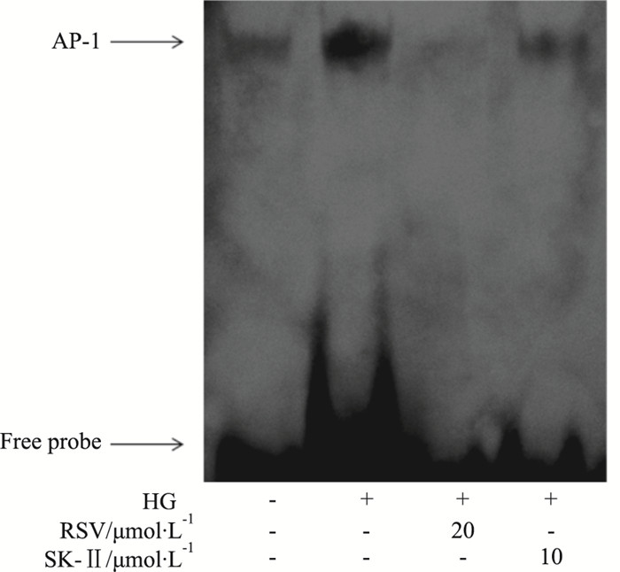 | Fig 4 Effects of resveratrol on high glucose-induced activation of AP-1 in GMC GMC was pretreated with resveratrol or SphK1 inhibitor Ⅱ (SK-Ⅱ) at the indicated concentrations for 2 h, followed by addition of high glucose for half an hour. Nuclear extracts were subjected to EMSA to examine AP-1 DNA binding activity. |