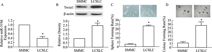 | Fig 1 Comparison of expressions of miR-519d and Twist1 between SMMC-7721 cells and LCSLCs(n=3) A: Expression of miR-519d assessed by qRT-PCR; B: Expression of Twist1 protein analyzed by Western blot; C: Sphere forming rate determined by sphere formation assay; D: Colony forming rate determined by colony formation assay in agar. SMMC: Human hepatocellular carcinoma SMMC-7721 cell line; LCSLC: The second-generation spheres derived from SMMC-7721 cell line. *P < 0.05 vs SMMC-7721 cells. |