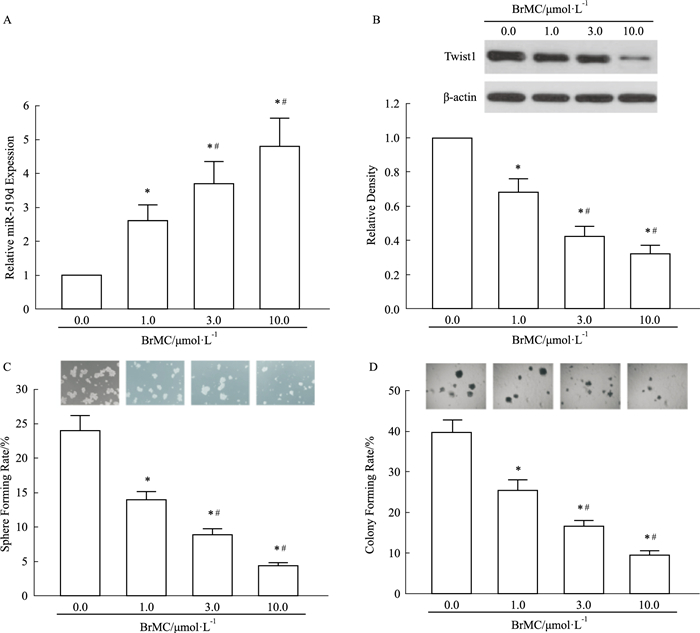 | Fig 2 Effects of BrMC on expressions of miR-519d and Twist1 in SMMC-7721-derived LCSLCs(n=3) A:Effect of various concentrations of BrMC (1.0, 3.0, 10.0 μmol·L-1) on expression of miR-519d assessed by qRT-PCR; B: Effect of various concentrations of BrMC (1.0, 3.0, 10.0 μmol·L-1) on expression of Twist1 protein analyzed by Western blot; C: Effect of various concentrations of BrMC (1.0, 3.0, 10.0 μmol·L-1) on sphere forming rate determined by sphere formation assay; D: Effect of various concentrations of BrMC (1.0, 3.0, 10.0 μmol·L-1) on colony forming rate determined by colony formation assay in Agar. *P < 0.05 vs 0.0 μmol·L-1 BrMC; #P < 0.05 vs 1.0 μmol·L-1 BrMC group. |
