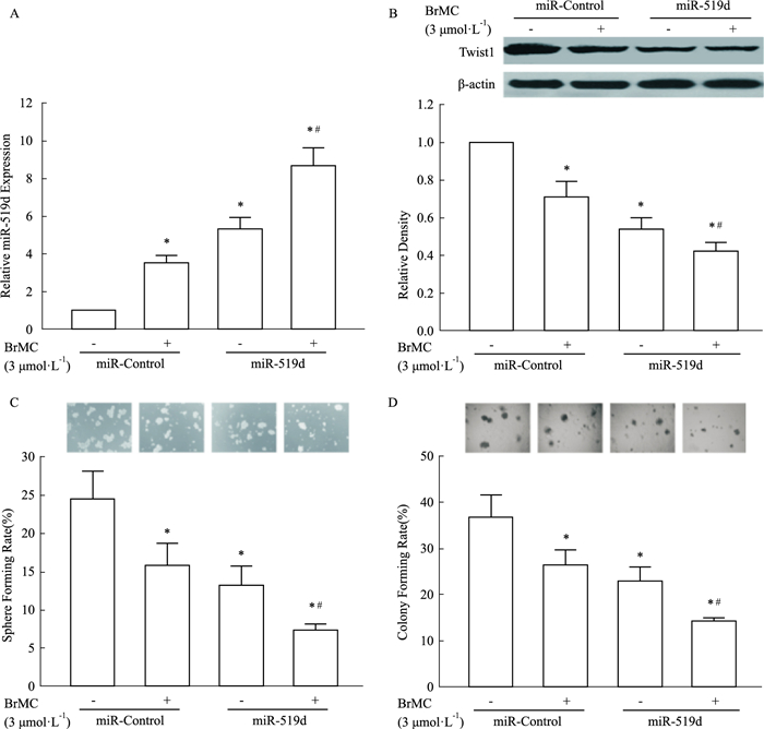 1.2 试剂按照文献[8]描述的方法合成BrMC,终浓度0.1%二甲基亚砜(DMSO)的DMEM培养基溶解。胰岛素、鼠抗人β-actin抗体购自美国Sigma-Aldrich公司;重组人表皮生长因子(epidermal growth factor,EGF)、重组人成纤维细胞生长因子(fibroblast growth factor, FGF)、B27添加物、DMEM/F12培养基、牛血清白蛋白(bovine serum albumin,BSA)、LipofectamineTM2000试剂,均购自Invitrogen公司;兔抗人Twist1多克隆抗体购自美国Abcam公司;辣根过氧化酶标记兔抗鼠Ig G、山羊抗兔Ig G二抗购自碧云天生物技术研究所;增强化学发光检测试剂购自美国Amersham Pharmacia Biotech公司;miR-519d引物、U6引物、hsa-miR-519d模拟物、519d抑制物、乱序对照寡核苷酸、pcDNA3.1-Twist1(NM_000474)或对照质粒pcDNA3.1-LacZ,均购自广州锐博生物科技有限公司;TaqMan MicroRNA逆转录试剂盒(Applied Biosystems,Thermo Fisher Scientific);SYBR® Premix Ex TaqTM(TaKaRa公司);双荧光素酶报告基因试剂盒(Promega公司);Bradford试剂盒(美国Bio-Rad Laboratories Hercules公司)。