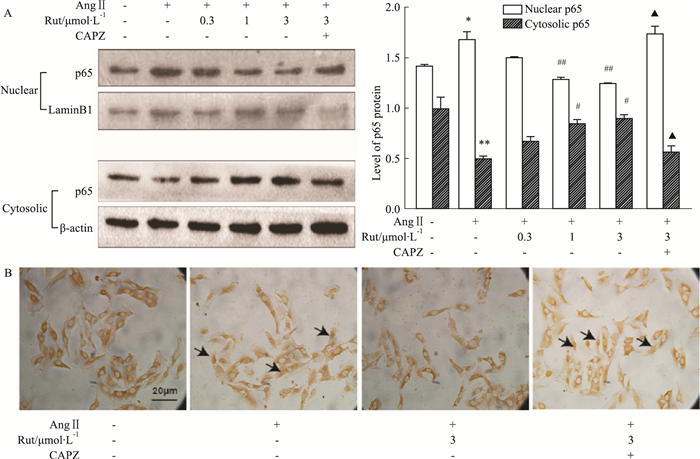Fig 3A的Western blot结果显示,Ang Ⅱ孵育细胞4 h可明显增加细胞核中NF-κB p65的水平,胞质中NF-κB p65水平则下降。不同浓度的Rut能剂量依赖性抑制AngⅡ诱导的p65入核,CAPZ可取消Rut这一效应(P<0.05)。免疫细胞化学结果显示,AngⅡ孵育细胞4 h可明显促进NF-κB p65蛋白从细胞质转位到细胞核,Rut(3.0 μmol·L-1)能在一定程度上抑制其入核,该效应可被CAPZ所阻断(Fig 3B)。