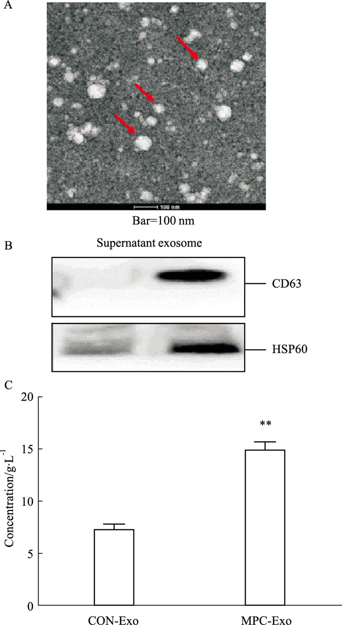 | Fig 1 Isolation and characterization of exosomes A: Electron micrographs of purified exosomes from rat serum; B: Western blot confirmed the presence of exosomal marker proteins CD63, HSP60; C: The concentration of exosomes was determined by BCA protein assay. Serum concentration of exosomes increased after MPC(x±s, n=3).**P<0.01 vs CON-Exo. |