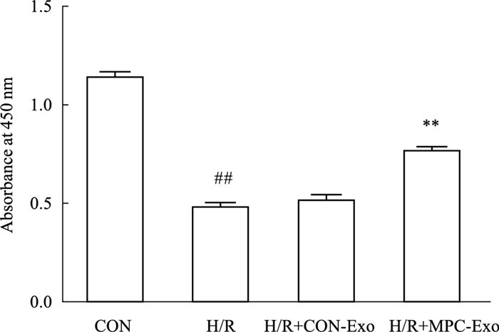 心肌细胞活力检测结果显示(Fig 2),与对照组相比,H/R组细胞活力明显降低(P < 0.01);与H/R组相比,H/R+MPC-Exo组细胞活力增加(P < 0.01), 而H/R+CON-Exo组细胞活力无明显增加,差异无统计学意义,说明MPC-Exo能增加细胞活力。