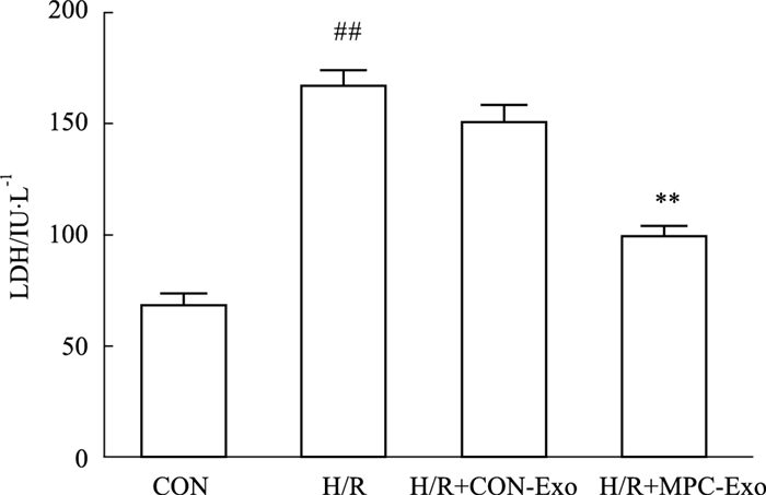 细胞损伤的程度可以用细胞培养液中LDH的水平来表示。如Fig 3所示,与对照组相比,H/R组心肌细胞H/R损伤后LDH活性明显增加(P < 0.01);与H/R组相比,H/R+MPC-Exo组可减轻心肌细胞H/R损伤,降低H9c2心肌细胞LDH的活性(P < 0.01), H/R+CON-Exo组LDH活性无明显变化,差异无统计学意义。说明MPC-Exo可降低H9c2心肌细胞LDH的活性。