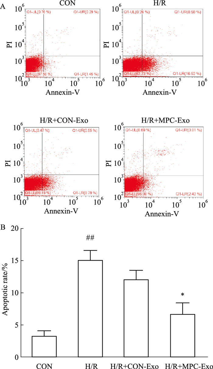 | Fig 4 MPC-Exo decreased rate of cell apoptosis in H9c2 cardiomyocytes(x±s, n=3) A: Representative scatter plots of the flow cytometry data for each group; B: Cell apoptosis was detected by Annexin V-FITC/PI staining and flow cytometry. Apoptotic rates were expressed as the relative number of apoptotic cells versus total cells. ##P < 0.01 vs CON; *P < 0.05 vs H/R. |