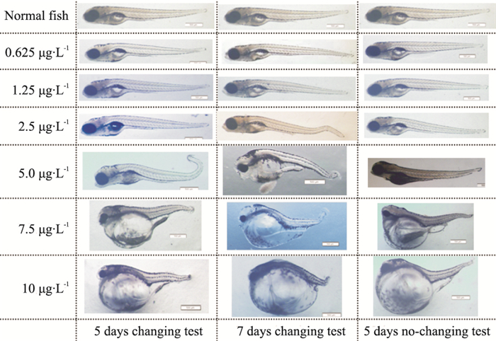 1.5 换液频率研究另取9组斑马鱼胚胎,在d 1时加入药液,实验期间不换液,在染毒5 d时结束实验,观察幼鱼发育情况。其他实验方法同“1.3”项。