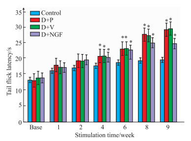 1.3 方法 1.3.1 l型糖尿病模型的制备大鼠适应1周后, D+P组、D+V组、D+NGF组大鼠禁食24 h, 继以腹腔注射STZ (50 mg·kg-1)。连续测量之后7 d的空腹血糖, 以7次血糖值均>16.7 mmol·L-1为l型糖尿病造模成功。
