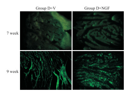 如Fig 3所示, 第7周时, 与对照组相比, D+P组、D+V组和D+NGF组大鼠心肌处的NGF、CGRP和神经纤维特异性标记物免疫荧光减弱, 但D+P组、D+V组和D+NGF组3组间无明显差异。如Fig 4所示, 第9周时, CGRP免疫反应阳性神经纤维多见于心外膜和心肌层, 尤其是血管周围和血管内皮处。D+P组和D+V组大鼠心肌处的NGF、CGRP和神经纤维特异性标记物PGP9.5比对照组和D+NGF组明显减少, 而对照组与D+NGF组无明显差异。