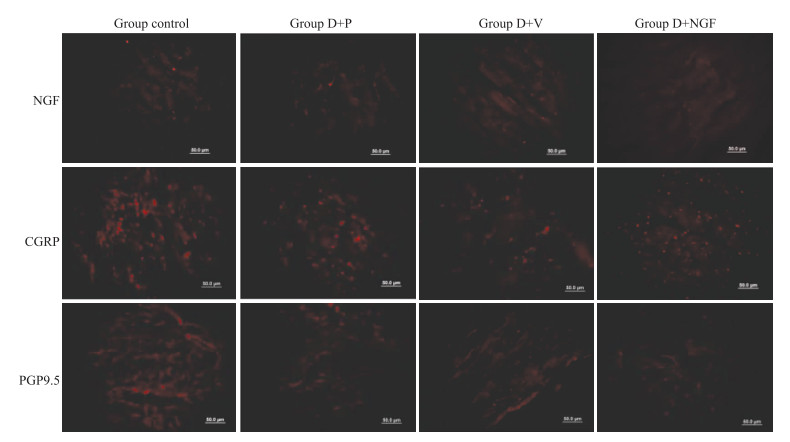 | Fig 3 Expression of NGF, CGRP and PGP9.5 in myocardium at 7th week (×40) Compared with group D+P, D+V and D+NGF, the red fluorescence could be seen clearly in group control. |