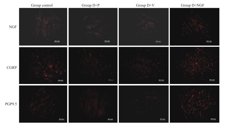 | Fig 4 Expression of NGF, CGRP and PGP9.5 in myocardium at 9th week (×40) Compared with group D+P and group D+V, the red fluorescence could be seen clearly in control group and group D+NGF. |