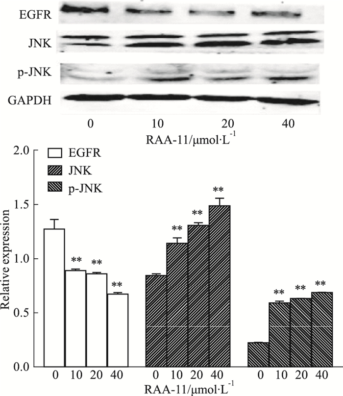如Fig 6所示,与对照组比较,RAA-11作用于MGC-803细胞48 h后,通路蛋白EGFR明显下调,JNK、p-JNK表达明显上升。提示RAA-11可能通过作用EGFR-JNK通路,抑制MGC-803细胞增殖和迁移,并诱导其凋亡。