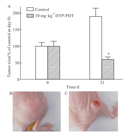 1.2.3 体内抗肿瘤实验肿瘤模型制备方法参考文献[9]。收集1×107个SGC7901/VCR细胞,接种于裸鼠右后背部。1周后,肿瘤体积大约为150 mm3,将16只裸鼠随机分为对照组(生理盐水,1次)和治疗组(DTP,10 mg·kg-1,1次)。生理盐水或者DTP通过尾静脉给药,避光饲养动物。24 h后,用浓度为0.5 mg·kg-1的乌拉坦将动物麻醉,对肿瘤部位进行激光照射(其余部位避光),光照波长650 nm,能量密度100 J·cm-2。21 d后,两组裸鼠的肿瘤大小用游标卡尺进行测量,并用以下公式计算体积:V(cm3)=d2(cm2)×D(cm)/2,d和D分别为肿瘤最短径和最长径。