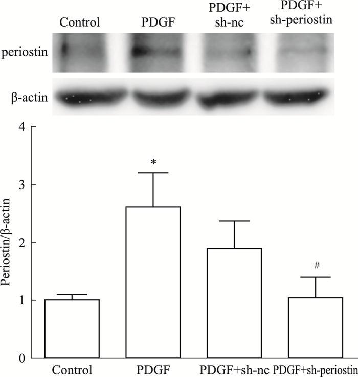 | Fig 4 Expression of periostin protein in transfected sh-periostin vector MMC stimulated by PDGF detected by Western blot (x±s, n=3) *P < 0.05 vs control group; #P < 0.05 vs PDGF+sh-nc group |