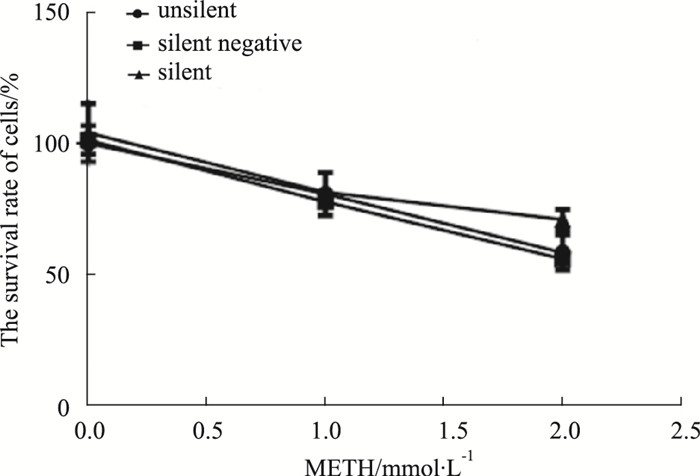 2 结果 2.1 CCK-8法检测结果如Fig 1所示, 使用METH(0、1.0、2.0 mmol·L-1)诱导体外培养SH-SY5Y细胞24 h后, SH-SY5Y细胞存活率随METH浓度的增加而减小(P<0.05), METH抑制SH-SY5Y细胞增殖。且在2.0 mmol·L-1 METH诱导下, 沉默组细胞存活率明显高于未沉默组和沉默阴性组(P<0.05)。
