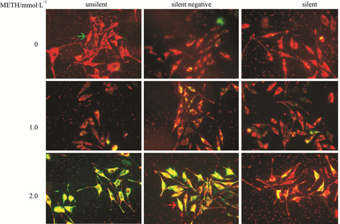 如Tab 1、Fig 3所示, 未沉默组、沉默阴性组和沉默组中, 各组组内与对照组(0 mmol·L-1 METH)比较, 1.0和2.0 mmol·L-1 METH诱导SH-SY5Y细胞, MMP水平降低(P<0.05), 荧光显微镜下, 随METH浓度增加, SH-SY5Y细胞红色荧光减弱, 绿色荧光增强; 与未沉默组和沉默阴性组相同浓度比较, 沉默组MMP水平升高(P<0.05), 红色荧光增强。