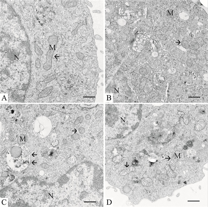 | Fig 4 Observation of mitochondrial ultrastructure of SH-SY5Y cells by TEM (scale bar= 5 μm) A: Control groups, mitochondria elliptical rod-like structure, normal and clear; B: Unsilent groups: mitochondrial globular structure increased significantly (arrow); C: Silent negative groups: mitochondrial globular structure increased significantly (arrow); D: Silent groups, mitochondrial globular structure decreased, rod structure increased (arrow). M: mitochondria; N: nuclei. |