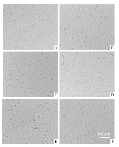 | Fig 3 Morphological changes of cortical neurons with different concentrations of gastrodin pre-treatment of 2 h and post-treatment of MA (0.5 mmol·L-1) for 24 h A: Control group; B: 0.5 mmol·L-1 MA group; C: 12.5 mg·L-1GAS+0.5 mmol·L-1 MA group; D:25 mg·L-1GAS+0.5mmol·L-1 MA group; E: 50 mg·L-1GAS+0.5 mmol·L-1 MA group; F: 100 mg·L-1 GAS+0.5 mmol·L-1 MA group. |