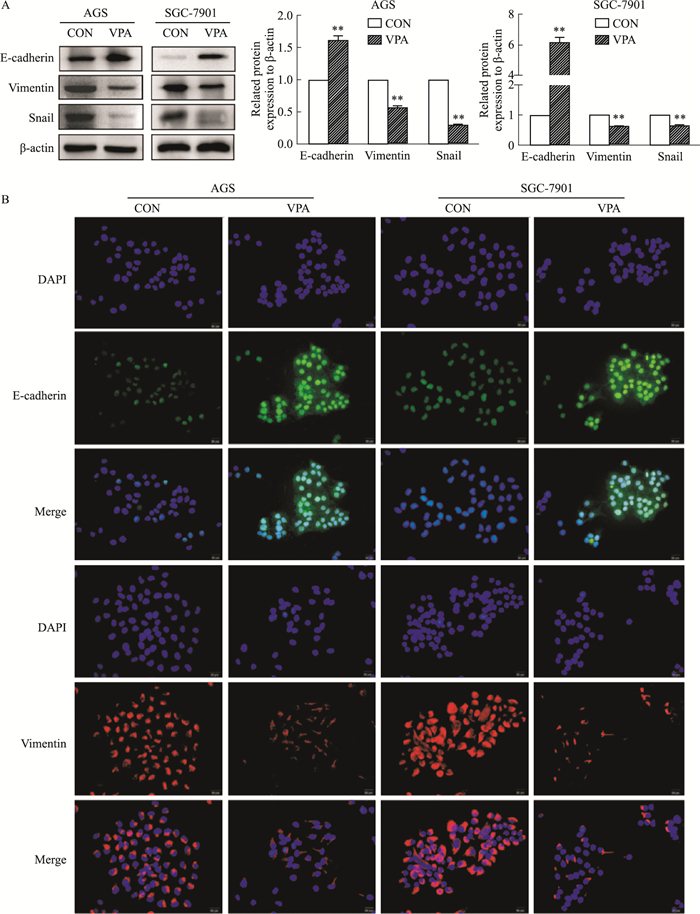 | Fig 4 EMT progression of AGS and SGC-7901 cells suppressed byVPA(x ± s, n=3) A:Expression of E-cadherin, Vimentin and Snail was detected in VPA-treated AGS and SGC-7901 cells by Western blot. β-actin was set as loading control; B:Expression of E-cadherin and Vimentin in VPA-treated AGS and SGC-7901 cells was detected by immunofluorescence staining(×400).**P < 0.01 vs control group. |