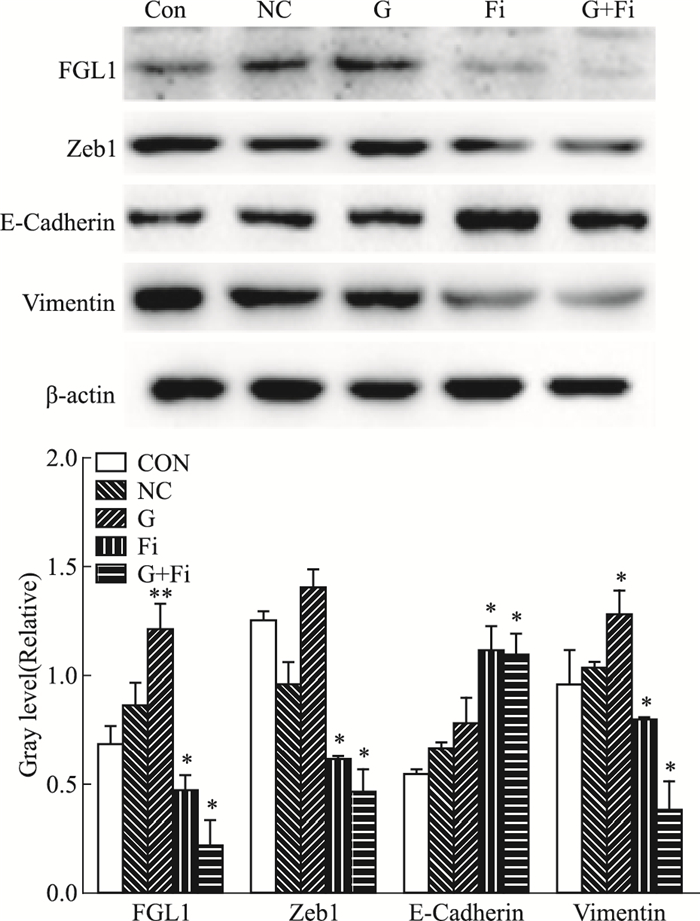 | Fig 6 Changes of Zeb1, E-cadherin and Vimentin expression in PC9/GR cells after FGL1 interferences detected by Western blot(x±s, n=3) Con: blank control group; NC:siRNA-NC group; G:gefitinib group; Fi: siRNA-FGL1-2; G+Fi:gefitinib combined with siRNA-FGL1-2;*P < 0.05, **P < 0.01 vs control |