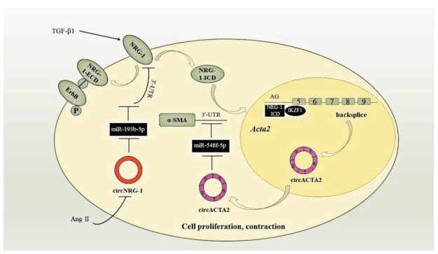 | Fig 1 NRG-1 could be cleaved into NRG-1-ECD and NRG-1-ICD under the stimulation of TGF-β1 to regulate the VSMC phenotype. In nucleus, NRG-1-ICD induced the formation of circACTA2 and up-regulated the expression of α-SMA; in cytoplasm, NRG-1-ECD reduced the phosphorylation level of ErbB receptor NRG-1: Neuregulin-1; TGF-β1: Transforming growth factor-β1; Ang Ⅱ: Angiotensin Ⅱ; α-SMA: smooth muscle actin α; IKZF1: IKAROS family zinc finger 1; VSMC: vascular smooth muscle cell. |
