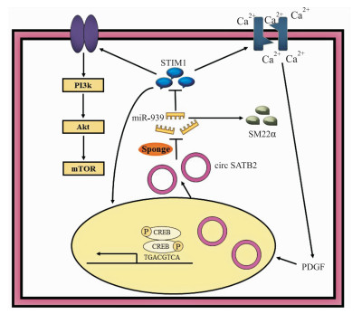 | Fig 2 circ-SATB2 was up-regulated and the expression of STIM1 was up-regulated in the proliferative VSMC, which inhibited the expression of SM22α. STIM1 was closely related to the proliferation and differentiation of VSMC. STIM1 could promote Akt/mTOR pathway activation, significantly increase SOCE, activate CREB phosphorylation, and promote cell proliferation and migration STIM1: Stromal interaction molecule 1; SOCE: store-operated calcium entry; CREB: cAMP response element binding protein; SM22α: smooth muscle 22alpha. |