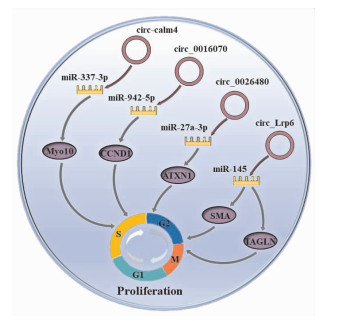 | Fig 3 circRNA could regulate VSMC proliferation by regulating cell cycle. circ-calm4/miR-337-3p, circ_0016070/miR-942-5p, circ_0026480/miR-27a-3p, and circ_Lrp6/miR-145 regulated cell cycle by targeting Myo10, CCND1, ATXN1, SMA, and TAGLN, respectively Myo10: Myosin 10; CCND1: Cyclin D1; ATXN1: Ataxin1; SMA: Smooth muscle actin; TAGLN: Transgelin. |