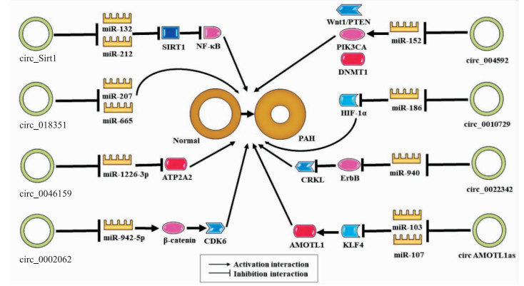 综上所述,circRNA充当miRNA海绵,通过与miRNA相互作用从而调控miRNA靶基因的表达,这丰富了人们对动物自然进化的认知,颠覆了RNA仅仅是DNA与编码蛋白之间的平凡使者的传统理念。circRNA与PAH的形成密切相关,通过与关联的miRNA相互作用,在PAH等心血管疾病的发生和发展中起着关键的调节作用,有望成为新型的PAH临床诊断标志物,在防治领域展现出光明的应用前景。