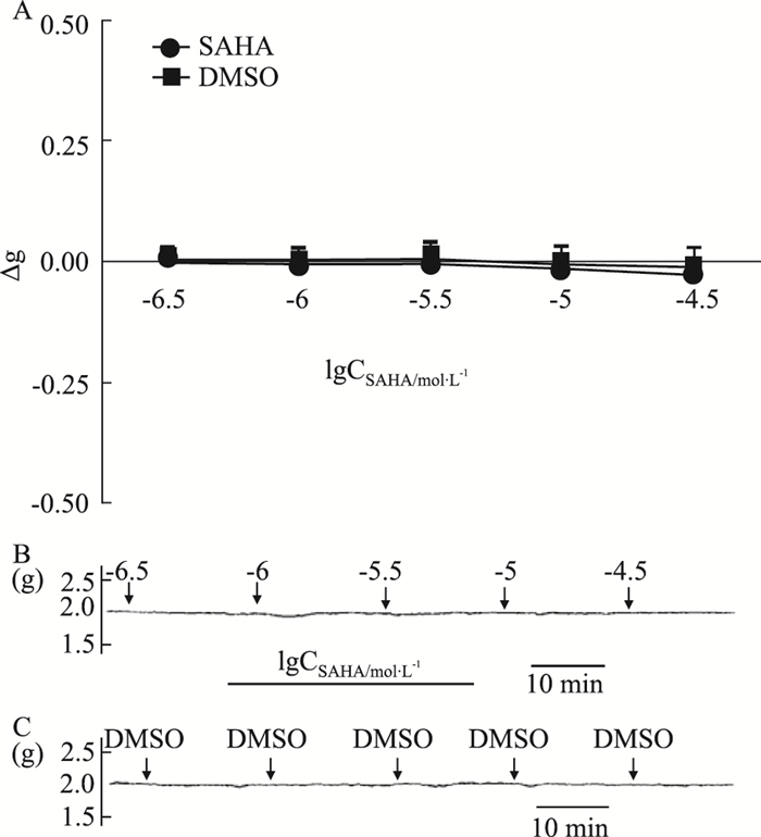 由于心血管疾病严重影响患者的生活质量, 抑制组蛋白去乙酰化酶渐成为心血管疾病领域研究热点。为了进一步丰富SAHA在血管方面的药理学资料,本文在离体条件下探究了SAHA对大鼠胸主动脉的作用,发现其能舒张血管,并初步研究了SAHA的舒张机制。