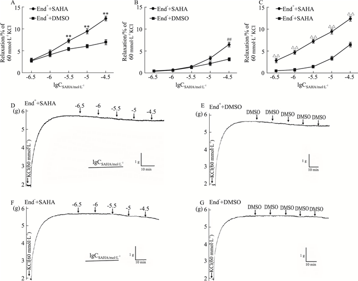 | Fig 2 Effect of SAHA on End+ and End- isolated thoracic aorta rings of rats precontracted with KCl (x±s, n=6) A and B: Effect of SAHA and DMSO on End+ (A) and End- (B) isolated thoracic aorta rings of rats precontracted with KCl (60 mmol·L-1), respectively. **P < 0.01 vs End++DMSO. ##P < 0.01 vs End-+DMSO. C: Effect of SAHA on End+ and End- isolated thoracic aorta rings of rats precontracted with KCl (60 mmol·L-1). △△P < 0.01 vs End-+SAHA. D, E, F and G: Original recording diagrams of SAHA and DMSO on End+ (D and E) and End- (F and G) isolated thoracic aorta rings of rats precontracted with KCl (60 mmol·L-1), respectively. |