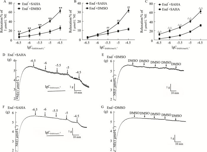 | Fig 3 Effect of SAHA on End+ and End- isolated thoracic aorta rings of rats precontracted with NE (x±s, n=6) A and B: Effect of SAHA and DMSO on End+ (A) and End- (B) isolated thoracic aorta rings of rats precontracted with NE (1 μmol·L-1), respectively. **P < 0.01 vs End++DMSO. ##P < 0.01 vs End-+DMSO. C: Effect of SAHA on End+ and End- isolated thoracic aorta rings of rats precontracted with NE (1 μmol·L-1). △△P < 0.01 vs End-+SAHA. D, E, F and G: Original recording diagrams of SAHA and DMSO on End+ (D and E) and End- (F and G) isolated thoracic aorta rings of rats precontracted with NE (1 μmol·L-1), respectively. |