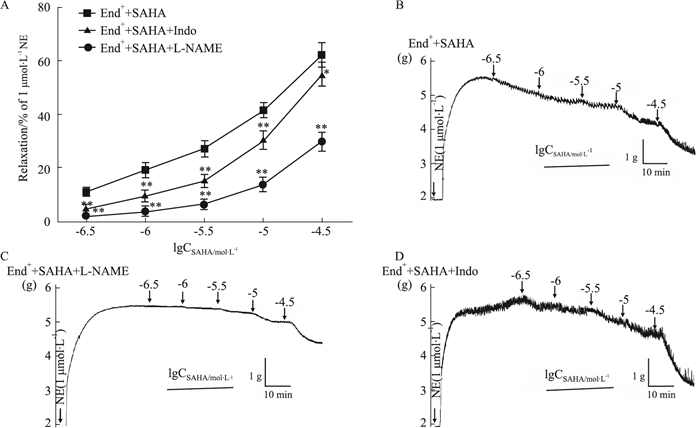 如Fig 4A所示,L-NAME (0.1 mmol·L-1)和Indo (0.01 mmol·L-1)预处理实验组与SAHA对照组相比,L-NAME和Indo预处理组SAHA各个累积浓度下对NE预收缩血管的舒张明显减小,End++SAHA+L-NAME组、End++SAHA+Indo组和End++SAHA组中SAHA的最大舒张率分别为(0.301±0.04)、(0.552±0.05)和(0.623±0.05),差异具有统计学意义(P < 0.05),说明预孵L-NAME和Indo可以减弱NE预收缩下SAHA的血管舒张作用,揭示SAHA舒张血管可能与增加内皮舒张因子NO和PGI2生成有关。