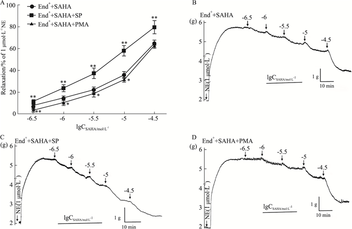 | Fig 5 Effect of SP and PMA on SAHA-mediated vasodilating effect on isolated thoracic aorta rings of rats precontracted with NE (x±s, n=6) A: Effect of SP (0.01 μmol·L-1) and PMA (0.1 μmol·L-1) on SAHA-mediated vasodilating effect on isolated thoracic aorta rings of rats precontracted with NE (1 μmol·L-1). B, C and D: Original recording diagrams of End++SAHA group (B), End++SAHA+SP group (C) and End++SAHA+PMA group (D), respectively. *P < 0.05, **P < 0.01 vs End++SAHA group. |