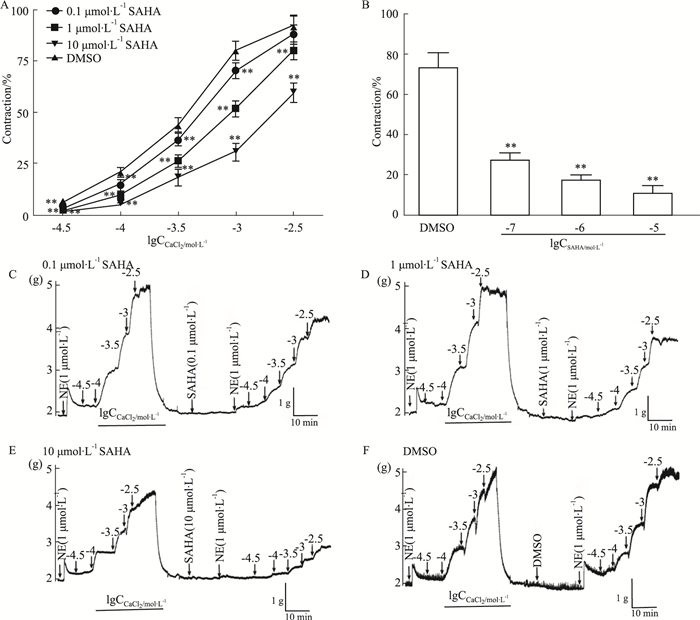 | Fig 6 Effect of SAHA on vascular contraction induced by extracellular calcium influx and intracellular calcium release (x±s, n=6) A and B: Effect of SAHA on vascular contraction induced by accumulated concentration CaCl2 (0.03, 0.1, 0.3, 1 and 3 mmol·L-1) (A) and NE (1 μmol·L-1) (B), respectively. C, D, E and F: Original recording diagrams of vascular contraction induced by accumulated concentration CaCl2 (0.03, 0.1, 0.3, 1 and 3 mmol·L-1) and NE (1 μmol·L-1), before and after incubating 0.1 (C), 1 (D), 10 μmol·L-1 SAHA (E) and solvent DMSO (F) for 30 minutes, respectively. **P < 0.01 vs DMSO solvent control group. |
