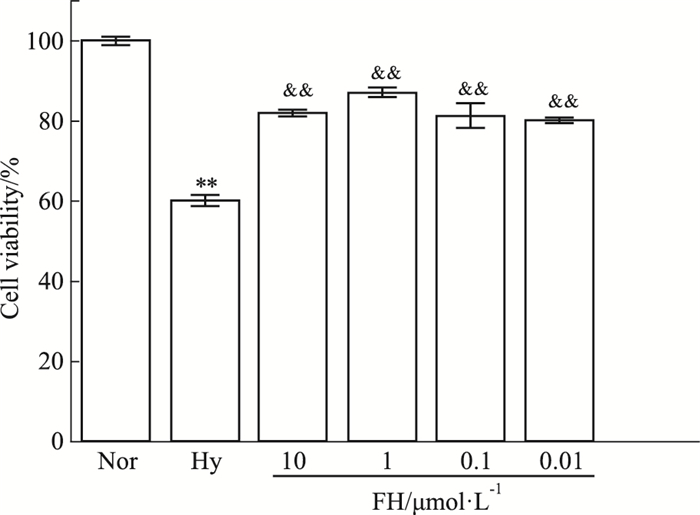 | Fig 2 Effect of fluoxetine on cell viability of PC12 cells in hypoxia condition (x±s, n=4) **P<0.01 vs Nor group; &&P<0.01 vs Hy group. |